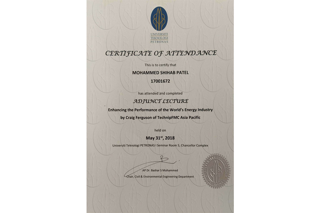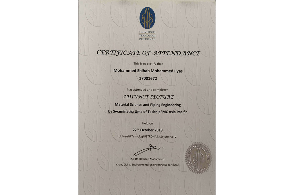 2. Adjunct Lecture, Material Science and Piping Engineering – TechnipFMC Asia Pacific, 22 Oct 2018, Universiti Teknologi PETRONAS, Malaysia.