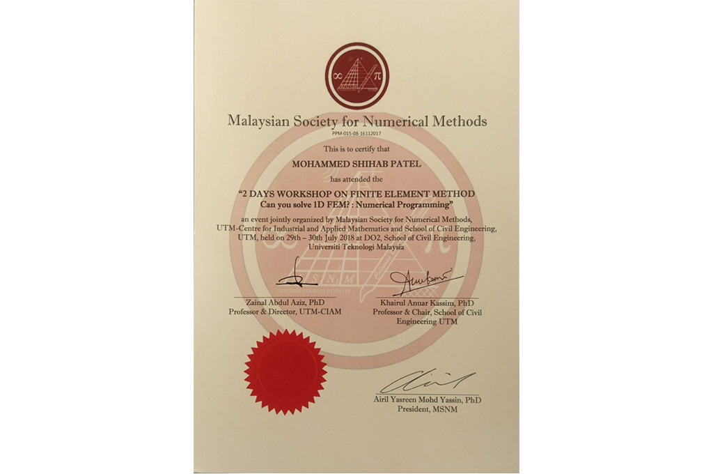 4. 2 Days Workshop on Finite Element Method and Numerical Programming, Malaysian Society for Numerical Methods, 29 – 30 Jul 2018, Universiti Teknologi Malaysia, Malaysia.