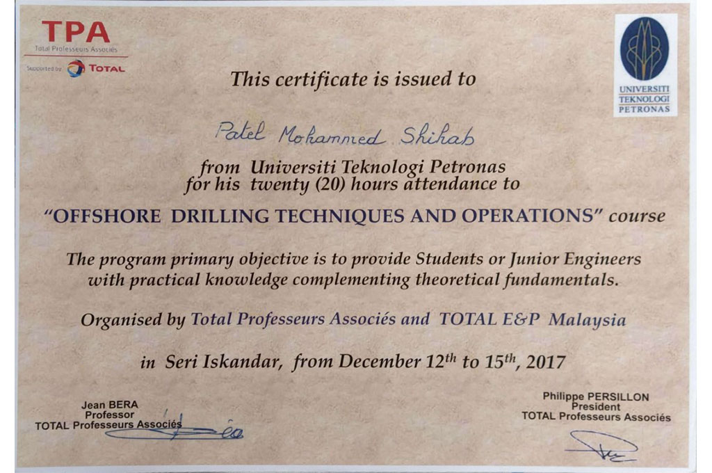 8. 4 Day Training on Offshore Drilling Techniques and Operations – Total Professeurs Associes and TOTOAL E&P Malaysia, 12 – 15 Dec 2017, Universiti Teknologi PETRONAS, Malaysia.