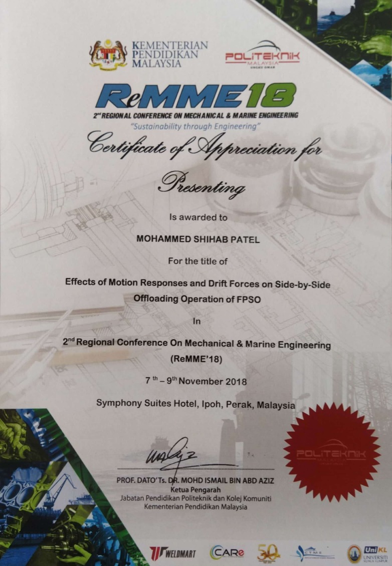 Mohammed Shihab Patel, Mohd. Shahir Liew, Zahiraniza Mustaffa, Abdurrasheed Said Abdurrasheed and Andrew Whyte. Influence of Partially Standing Waves on Offloading Operations for Shuttle Tanker. In 2018 Regional Conference On Mechanical And Marine Engineering (ReMME‘18), ReMME, 2018