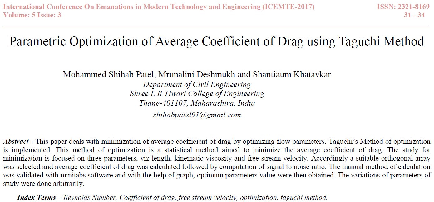 Patel M.S. and Upletawala A., 2017. Parametric Optimization of Energy Loss of a Spillway using Taguchi Method. In International Journal of Engineering, Technology, Science and Research (IJETSR)[Scopus Indexed]