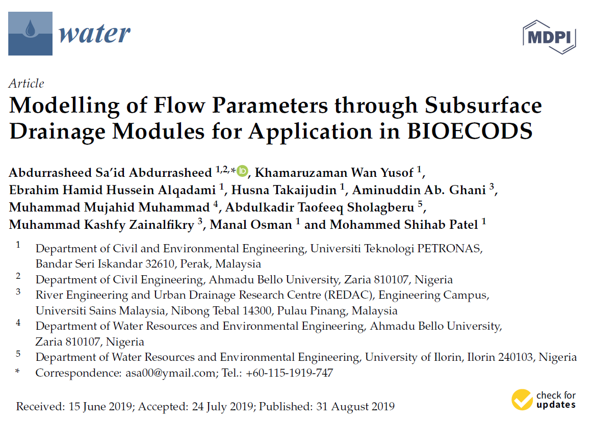 Muhammad M.M. Sholagberu, A.T., Zainalfikry M.K., Osman M. and Shihab Patel M., 2019. Modelling of Flow Parameters through Subsurface Drainage Modules for Application in BIOECODS. Water, 11(9), p.1823. [ISI Indexed, IF = 2.544]